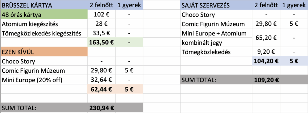 Teljesen őszintén mi valahogy sosem választjuk ezeket a városkártyákat. Mindig megnézem őket 'hátha' jeligével, de a végén mindig jobban jövünk ki nélküle. A brüsszeli például nem tartalmazza alapból a tömegközlekedést, ahogy az Atomium belépőket sem. A Mini Europe-hoz is csak 20% kedvezmény járt volna. A Comic Figurine Múzeum pedig semmilyen formában nem volt támogatott. Készítettem egy összehasonlítást, hogy mennyibe került volna ha veszünk és milyen kiadásaink lettek volna nélküle.